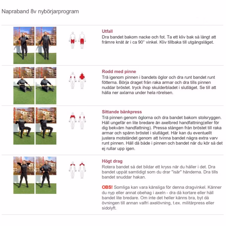 Kom igång - 8v nybörjarprogram är det perfekta programmet för dig som vill börja träna men som inte är säker på hur du ska lägga upp din träning eller vilka övningar du borde använda. Programmet ger dig en effektiv träning som kommer att göra dig både starkare och ge dig bra muskelökningar. Du kan välja mellan att träna två eller tre gånger i veckan och programmet består av 27 videodemonstrerade övningar, fördelade över 3 träningsblock som sträcker sig över 8 veckor. Övningarna är anpassade för nybörjare - tekniskt enkla att utföra men med en riktigt bra träningseffekt. Allt du behöver för att genomföra programmet är Napraband powerbands och ett träskaft som du t.ex. hittar på Jula eller annan återförsäljare för ca 30kr. Ett vanligt skaft till skurmoppen går också bra.